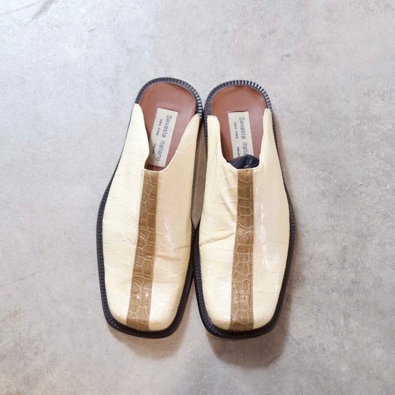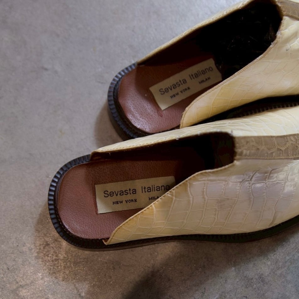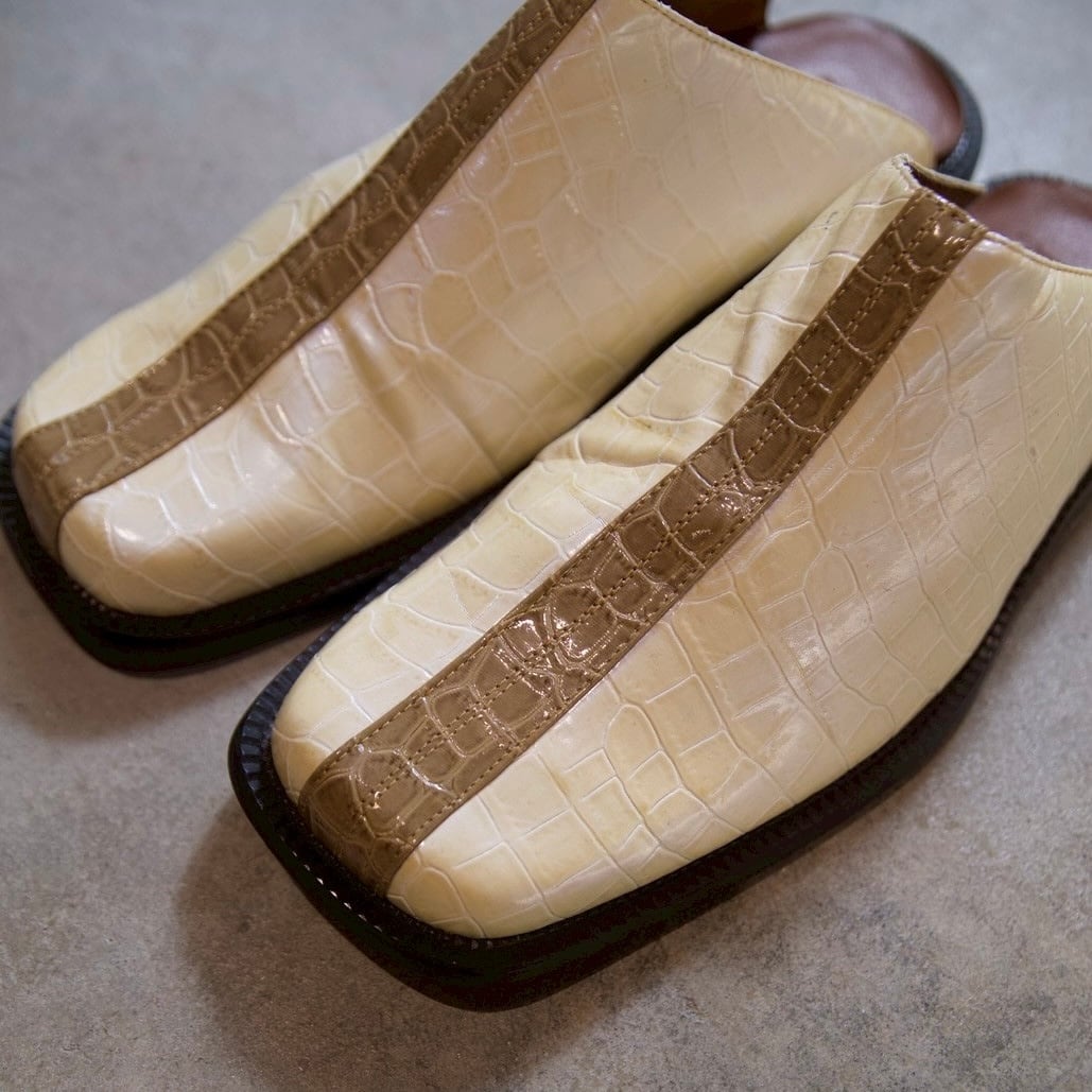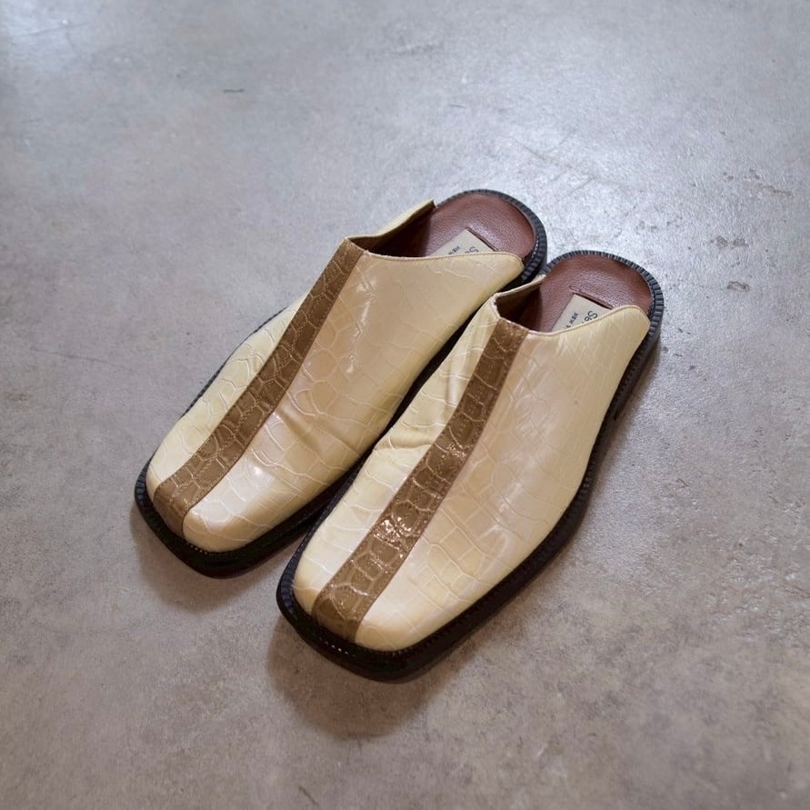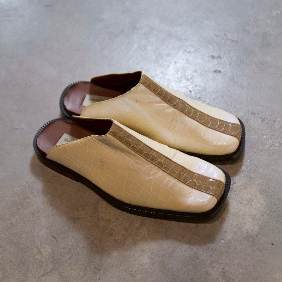 クロコダイル調の型押しが施されたミュールシューズです!